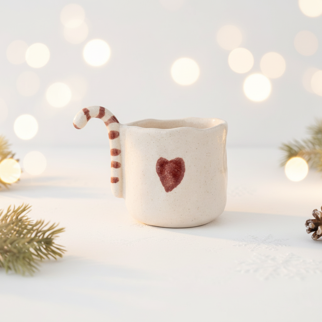 Celebrate the holidays with a cup designed to spark joy and warmth. Featuring a whimsical candy cane handle and a hand-sculpted heart at the center, this festive ceramic mug brings a touch of handmade charm to your Christmas mornings, cozy evenings, and seasonal gatherings.