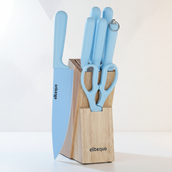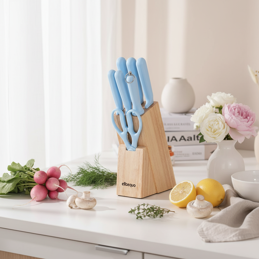 Experience the perfect blend of traditional craftsmanship and contemporary innovation. This comprehensive 9-piece set pairs our signature skyline blue blades with a classic wooden block, creating a timeless aesthetic that honors tradition while delivering modern culinary performance.