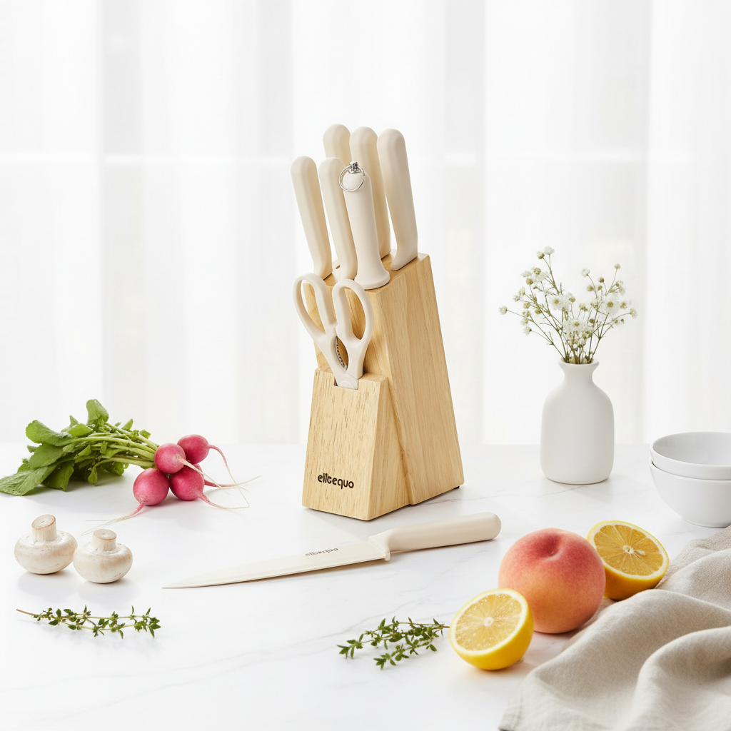 ✔ Natural Wood Block - Compact vertical storage (hand wash only)